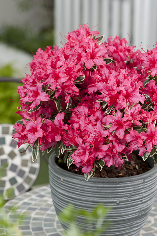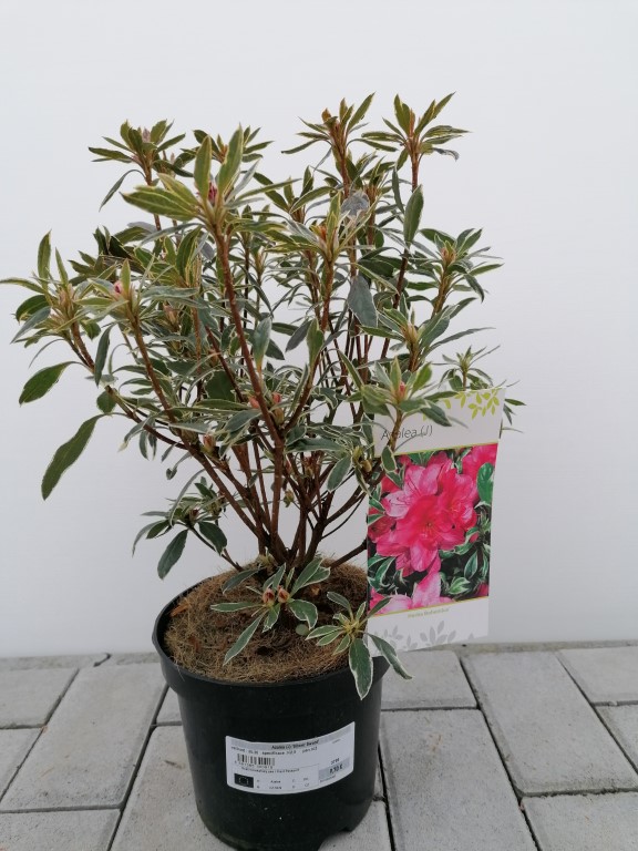 Dekoratívna, vždyzelená azalka s výrazne panašovanými listami a fialovoružovými kvetmi.