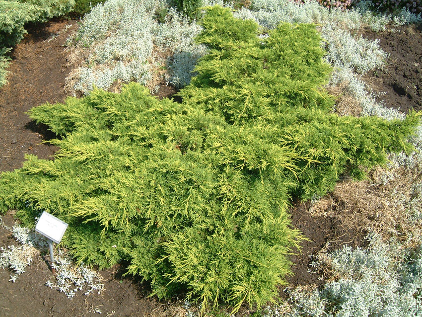 Charakteristika: Nízka, rozložito rastúca borievka so zlatistým ihličím.