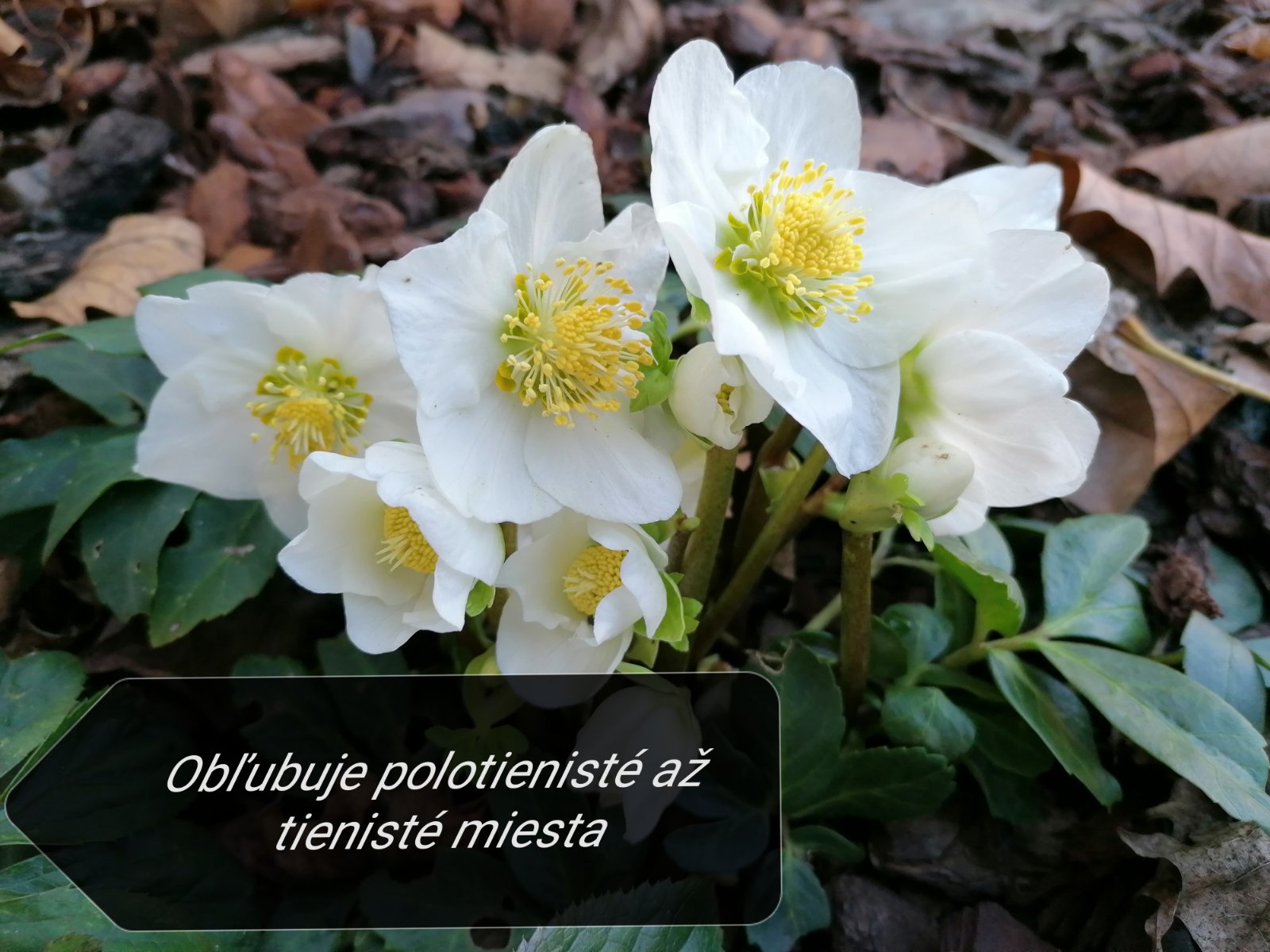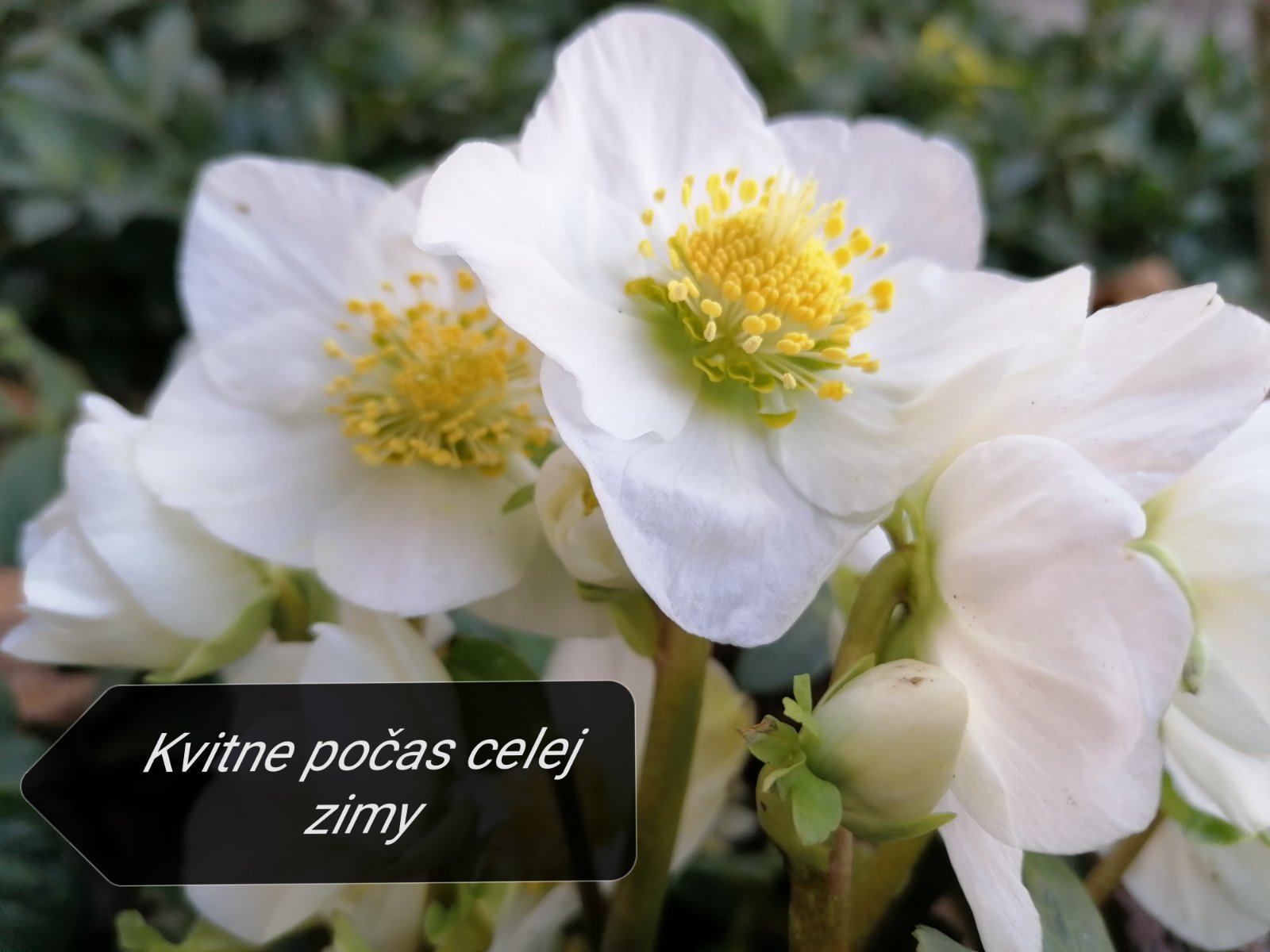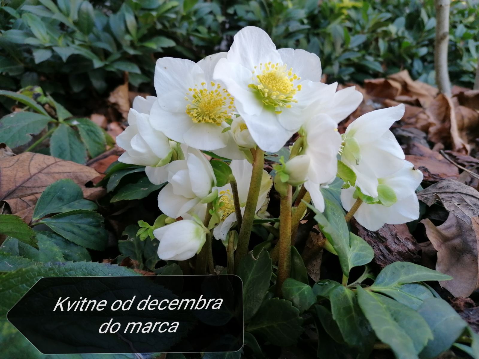 KvitnutieKvitne v čase, kedy je väčšina záhrady v hlbokom spánku, od decembra až do marca. Kvety sú pomerne veľké, tanierovité a majú čistú, snehobielu farbu, ktorá v strede kontrastuje so žltými tyčinkami. Kvety si udržujú dlhú trvácnosť a počas chladných nocí sa môžu čiastočne zatvárať.