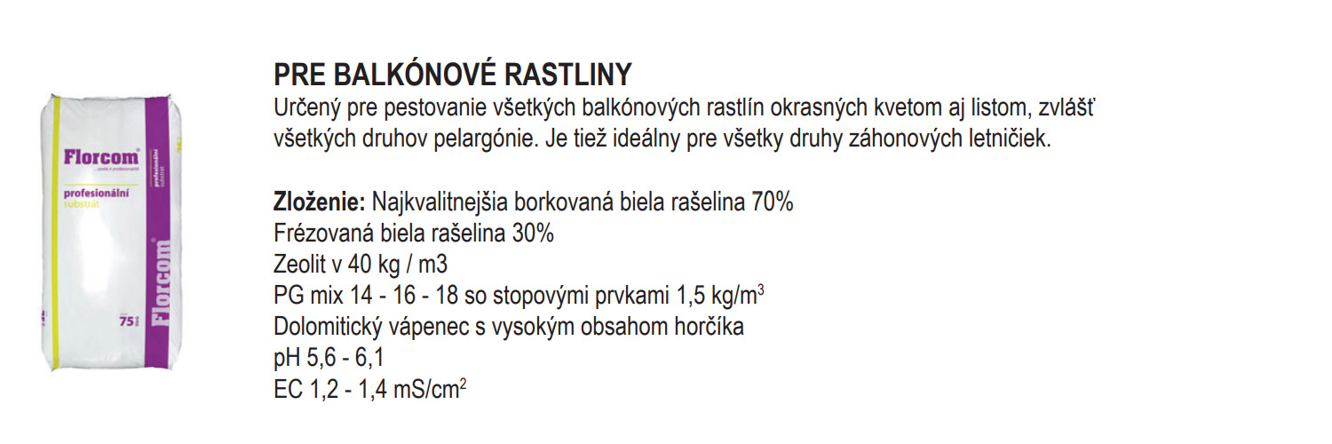 Substrát pro balkónové rostliny Speciální substrát určený pro pěstování všech balkonových rostlin okrasných květem i listem, zvláště pak všech druhů Pelargonií. Je také ideální pro všechny druhy záhonových letniček.Složení: Nejkvalitnější borkovaná bílá rašelina 70%Frézovaná bílá rašelina 30%Zeolit v 40 kg/m3PG mix 14 - 16 - 18 se stopovými prvky 1,5 kg/m3Dolomitický vápenec s vysokým obsahem hořčíkupH 5,6 – 6,1EC 1,2 - 1,4 mS/cm2Použití a charakteristika: Lehký typ vzdušného substrátu, dobře vyhnojený, s optimálně nižším pH pro balkonové rostliny okrasné květem (zejména Pelargonie) a také pro všechny další letničky. Použitím zeolitu je substrát stabilní vůči výkyvům pH a výkyvům hnojení. Sorpční schopnost zeolitu zabra?uje vyplavování hnojiv a jejich příliš rychlému uvol?ování. Díky této schopnosti a dobré zásobě živin není téměř nutné kratší kultury letniček a balkónových rostlin během pěstování přihnojovat.Substrát je nesléhavý a dobrou strukturou, která udržuje optimální poměr vzduchu a vláhy.