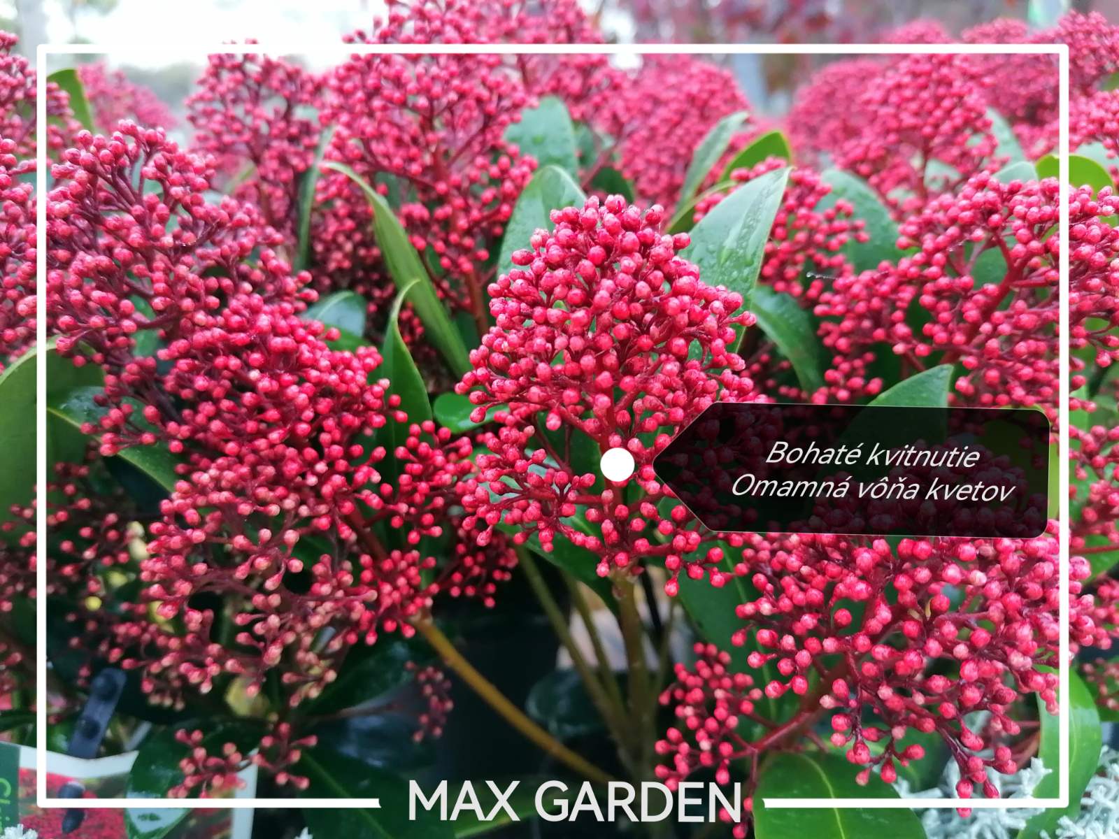Skimia japonská ´Rubella´ je obľúbený, nízky a vždyzelený krík, ktorý je cenený predovšetkým pre svoju atraktivitu počas chladných mesiacov. Na jeseň vytvára veľké, lesklé, sýtočervené púčiky, ktoré zostávajú na rastline po celú zimu. Sú výrazným farebným akcentom a rozžiaria každú záhradu alebo terasu v čase, keď už väčšina rastlín spí.