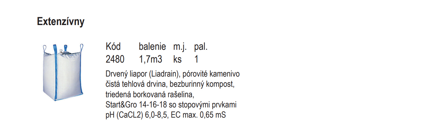 Substrát pro vegetační kryt střech určený pro nenáročné, především suchomilné rostliny a trávy, které můžeme s úspěchem na střechách pěstovat ve vrstvě substrátu vysoké 5-20 centimetrů. Extenzivní střešní substrát je dobře propustný s celkovým objemem vzduchových pórů více než 60% a neutrálním pH. Objemová hmotnost substrátu v suchém stavu je 750kg/m3 a 1350kg/m3 při maximálním nasycení vodou, což umožní použití i na střechách s menší únosností. Drenážní schopnost a současně vysokou vodoakumulační kapacitu zajišťuje optimální poměr a kvalita použitého materiálu, který si zachovává svoje fyzikální vlastnosti a je stále funkční.