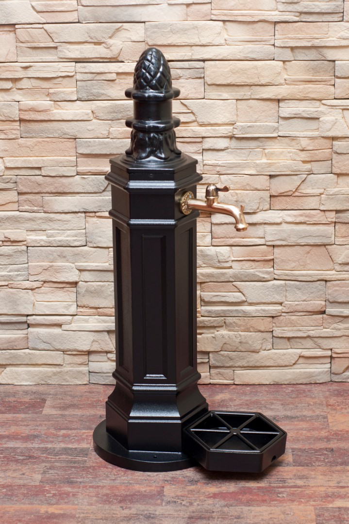 Záhradný hydrant je vyrábaný  z hliníkovej zliatiny,takže Vám nebude korodovať. Ošetrené kvalitným náterom,ktorý odoláva UV žiareniu a opotrebovaniu vo vonkajšom prostredí. Je praktické,lebo má v držiak aby ste položili vedno a naplnili ho vodou. Montáž je jednoduchá ukotvuje sa 3 skrutkami do otvorov ktoré sú pred pripravené. Šroby a hmoždinky do betónu sú súčasťou záhradnej studňe.