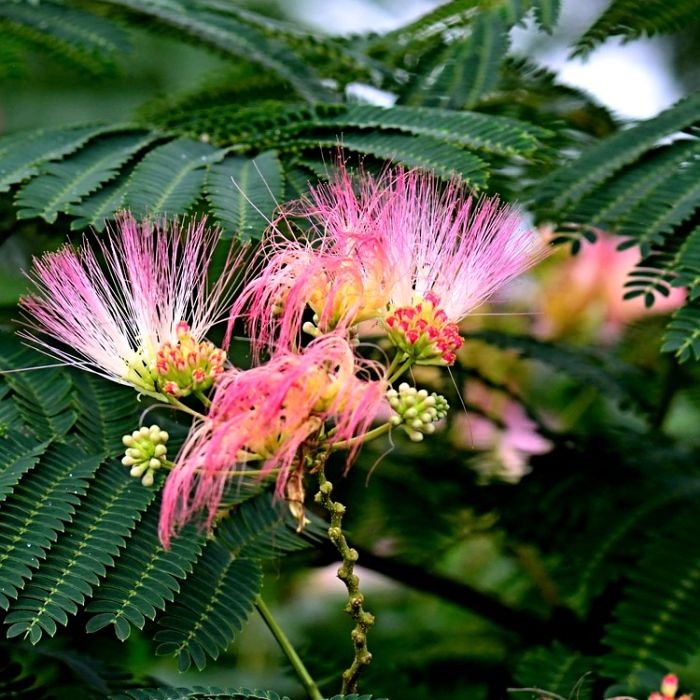 Pozor: Albizia julibrissin má citlivý koreňový systém, ktorý sa po poškodení ťažko regeneruje. Pri výsadbe je kľúčové zachovať koreňový systém neporušený – rastlinu nikdy nevyťahujte za kmeň, kvetináč opatrne zrežte alebo zsuňte dole. Zeminu z balu nerozrušujte ani neoplachujte;
