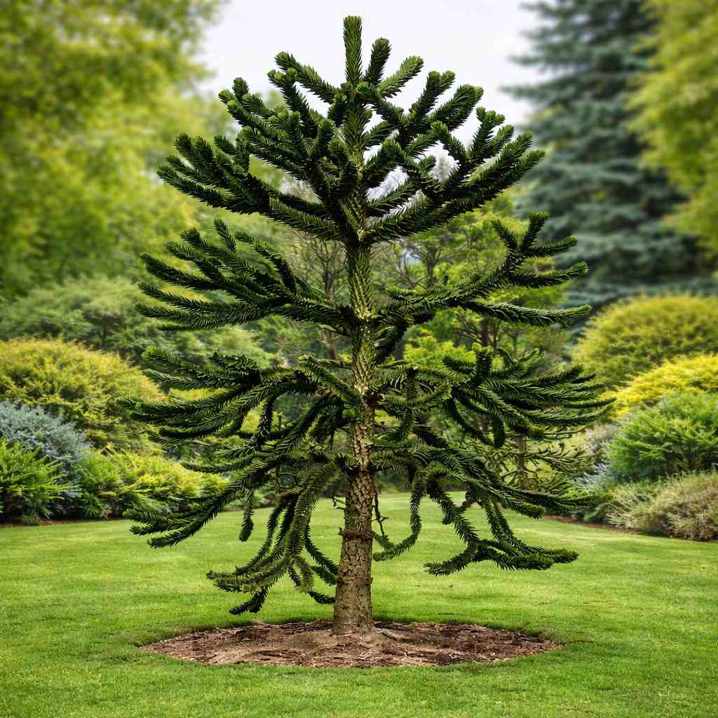 CharakteristikaAraukária čílska 'Araucana', známa aj pod názvom "opičí strom", patrí medzi najexotickejšie a najfascinujúcejšie ihličnany, ktoré možno pestovať v našich podmienkach. Tento strom pochádza z Ánd a je považovaný za živú fosíliu. Jeho vzhľad je absolútne unikátny – má pravidelne praslenovité vetvy, ktoré sú husto pokryté tuhými, trojuholníkovými a veľmi pichľavými šupinatými listami sýtozelenej farby. Ihličie pokrýva nielen vetvy, ale aj samotný kmeň, čo stromu dodáva prehistorický vzhľad.