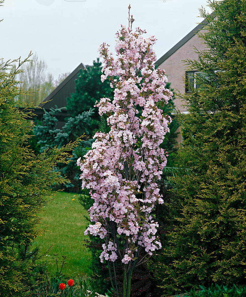 CharakteristikaPrunus serrulata 'Amanogawa' (v preklade „Nebeská rieka“) je unikátna japonská sakura, ktorá si zachováva svoj prísne stĺpovitý a úzky tvar počas celého života. V tejto forme je štepená na kmeni, čo podčiarkuje jej vznešený vzhľad a umožňuje jej vyniknúť ako solitér v trávniku, predzáhradke alebo vo veľkom kvetináči na terase.