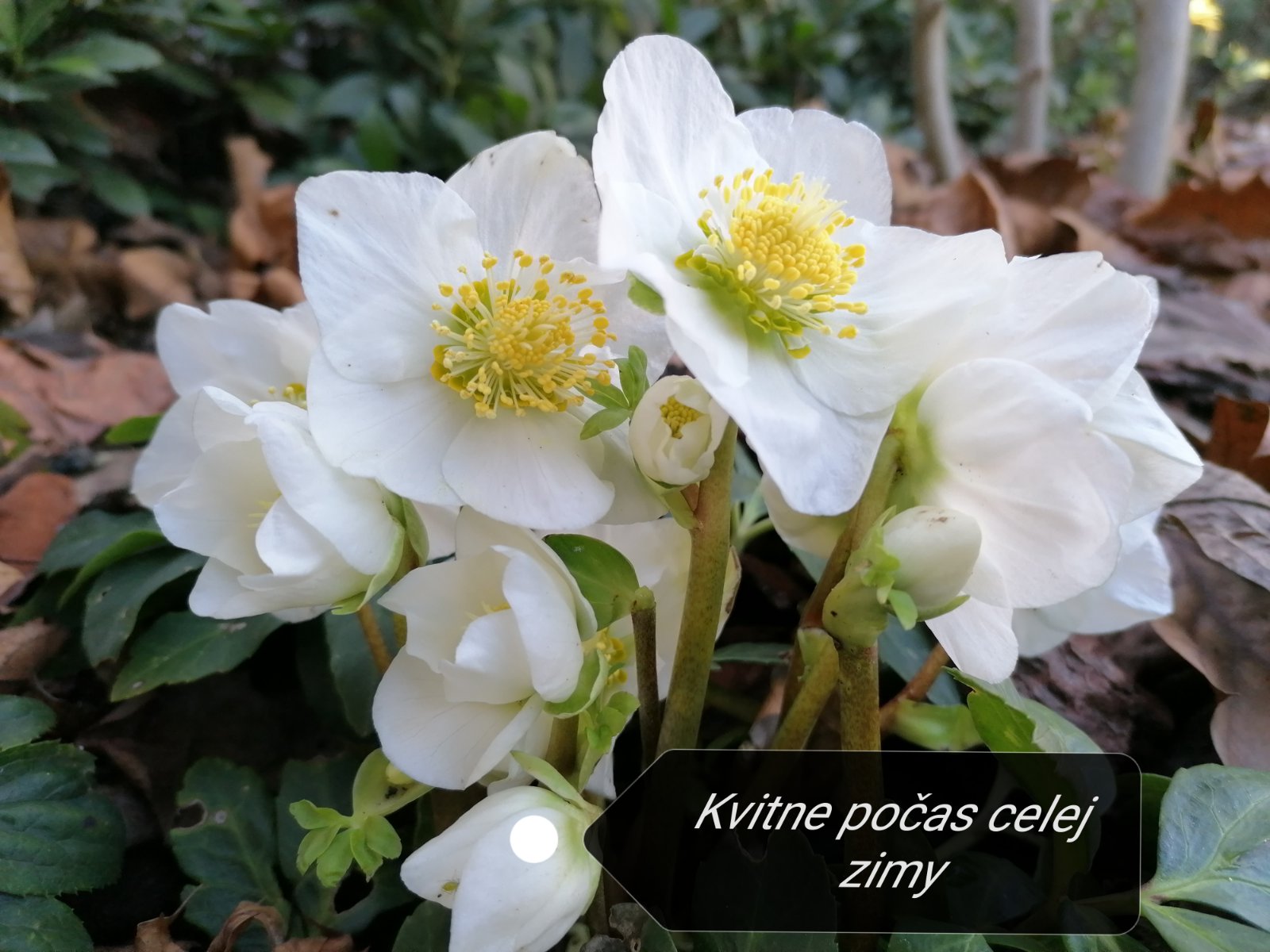 KvitnutieKvitne v čase, kedy je väčšina záhrady v hlbokom spánku, od decembra až do marca. Kvety sú pomerne veľké, tanierovité a majú čistú, snehobielu farbu, ktorá v strede kontrastuje so žltými tyčinkami. Kvety si udržujú dlhú trvácnosť a počas chladných nocí sa môžu čiastočne zatvárať.