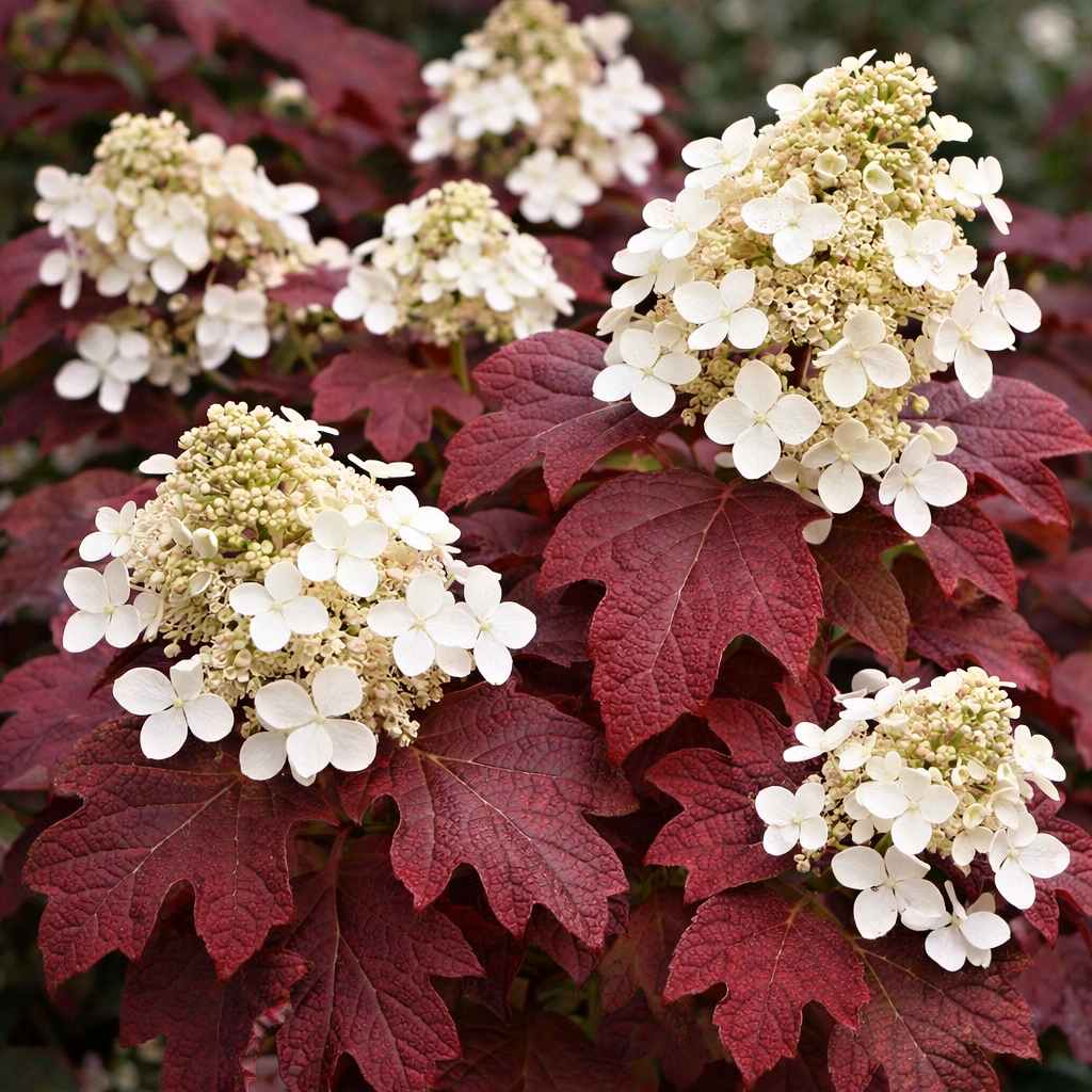 CharakteristikaHydrangea quercifolia ´Burgundy´ patrí medzi najatraktívnejšie kultivary hortenzie dubolistej. Svoj názov dostala podľa unikátneho sfarbenia listov, ktoré sa s príchodom chladnejších jesenných dní menia z tmavozelenej na sýtu, žiarivú vínovočervenú až burgundskú farbu. Listy sú veľké, hlboko vykrajované a pripomínajú listy duba červeného, pričom na rastline zostávajú veľmi dlho až do neskorej jesene.