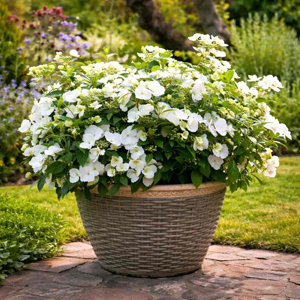 Kvety sú čisto biele, plochého typu (lacecap) s jemne zúbkovanými okrajmi. S postupujúcim časom a klesajúcimi teplotami môžu získať romantický svetloružový nádych. Rastlina má elegantne previsnutý habitus, čo z nej robí ideálnu kandidátku do závesných črepníkov, vyvýšených záhonov alebo ako solitér, ktorý preteká cez okraje kvetináčov. Kvitne opakovane počas celého leta, čím predlžuje estetický zážitok z vašej záhrady či terasy.