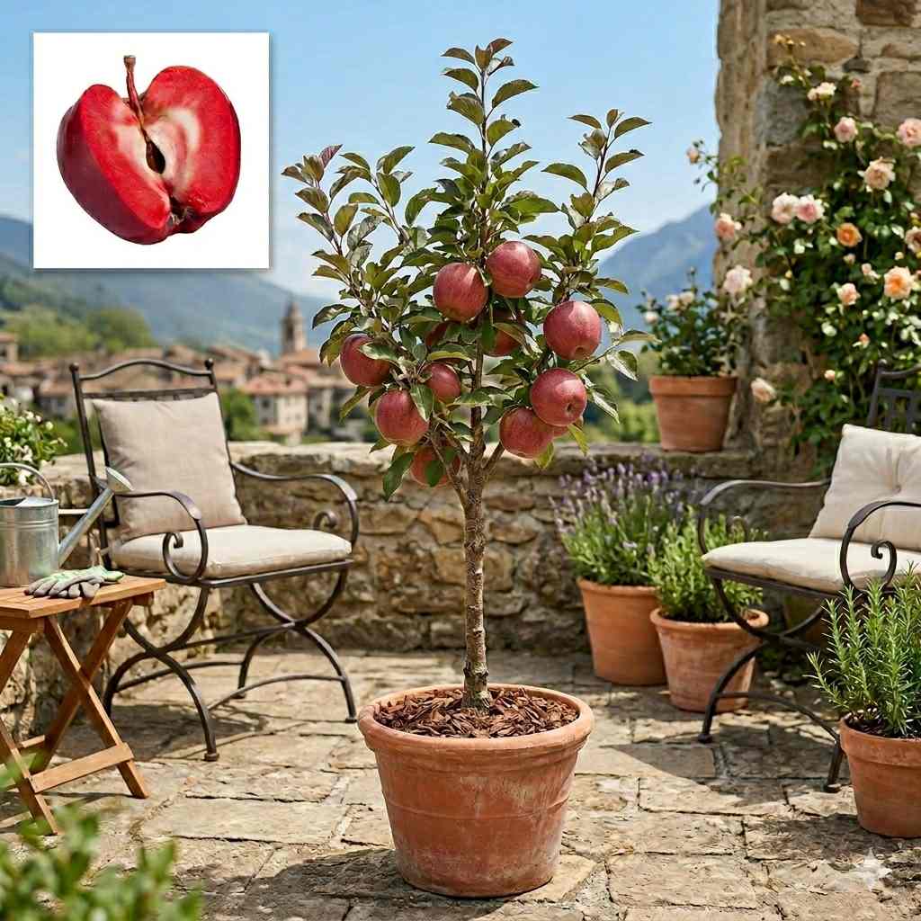 CharakteristikaJabloň ´Vampira Geneva´ je fascinujúca odroda, ktorá očarí nielen svojím menom, ale predovšetkým unikátnymi plodmi. Ide o výnimočnú jabloň s tmavočervenou šupkou a krvavočervenou dužinou. Táto verzia na nízkom 40 cm kmeni je špeciálne upravená pre pestovanie v nádobách a malých priestoroch, kde pôsobí mimoriadne dekoratívne počas celého roka.