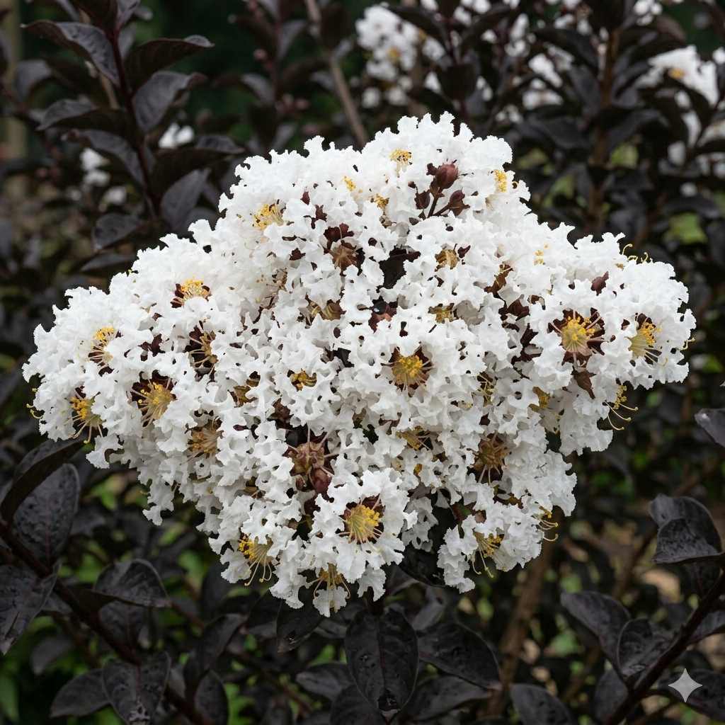CharakteristikaMyrta krepová Black Solitaire ´Pure White´ predstavuje jeden z najelegantnejších kontrastov, aké príroda a šľachtenie ponúkajú. Táto unikátna odroda sa pýši hlbokými, vínovými až čiernymi listami, ktoré si svoju temnú intenzitu zachovávajú počas celého leta. V druhej polovici sezóny sa na koncoch výhonkov otvárajú bohaté strapce žiarivých snehobielych kvetov. Jemne zvlnené, krepové okvetné lístky pôsobia na tmavom olistení ako čipka, čo vytvára v záhrade nevídaný vizuálny efekt.