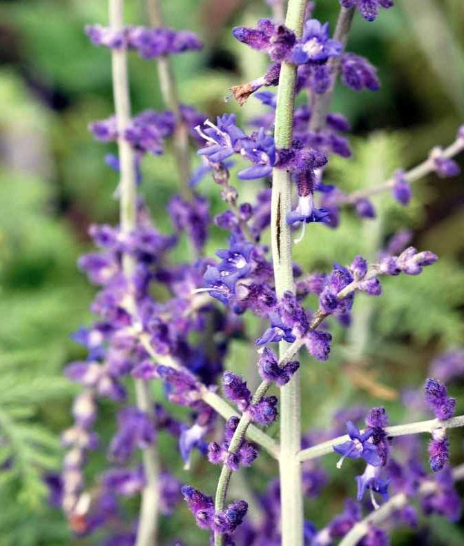 kvitne bohato, postupne od júla až do októbra a vytvára dlhé súkvetia fialovomodrých kvetov