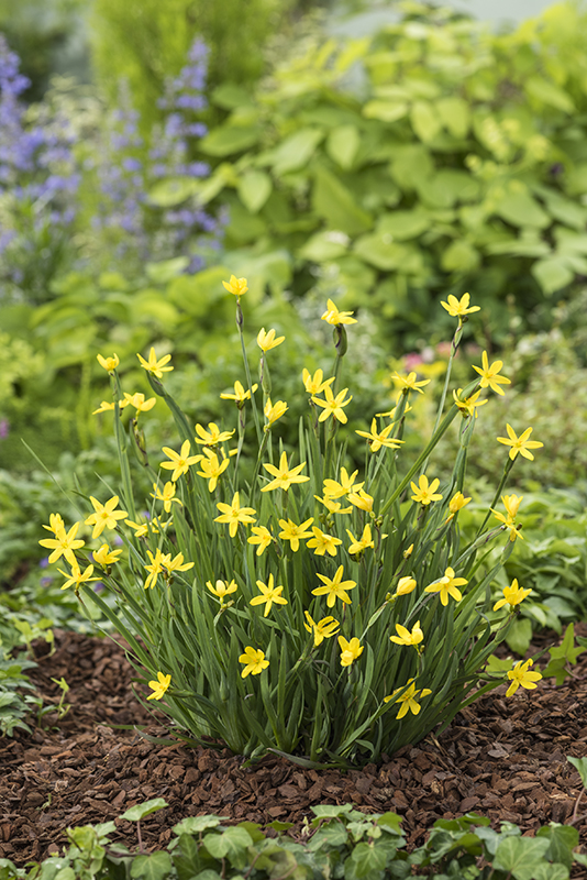 Tvorí trsy úzkych, trávovitých listov zelenej farby. Kvety sú jasne žlté so šiestimi okvetnými lístkami, pričom ich stred môže mať jemne tmavší odtieň.