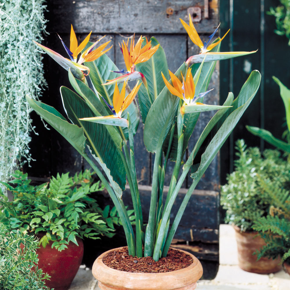 • na jar rastlina kvitne nádhernými, oranžovo-modrými kvetmi, ktoré pripomínajú hlavu farebného vtáka