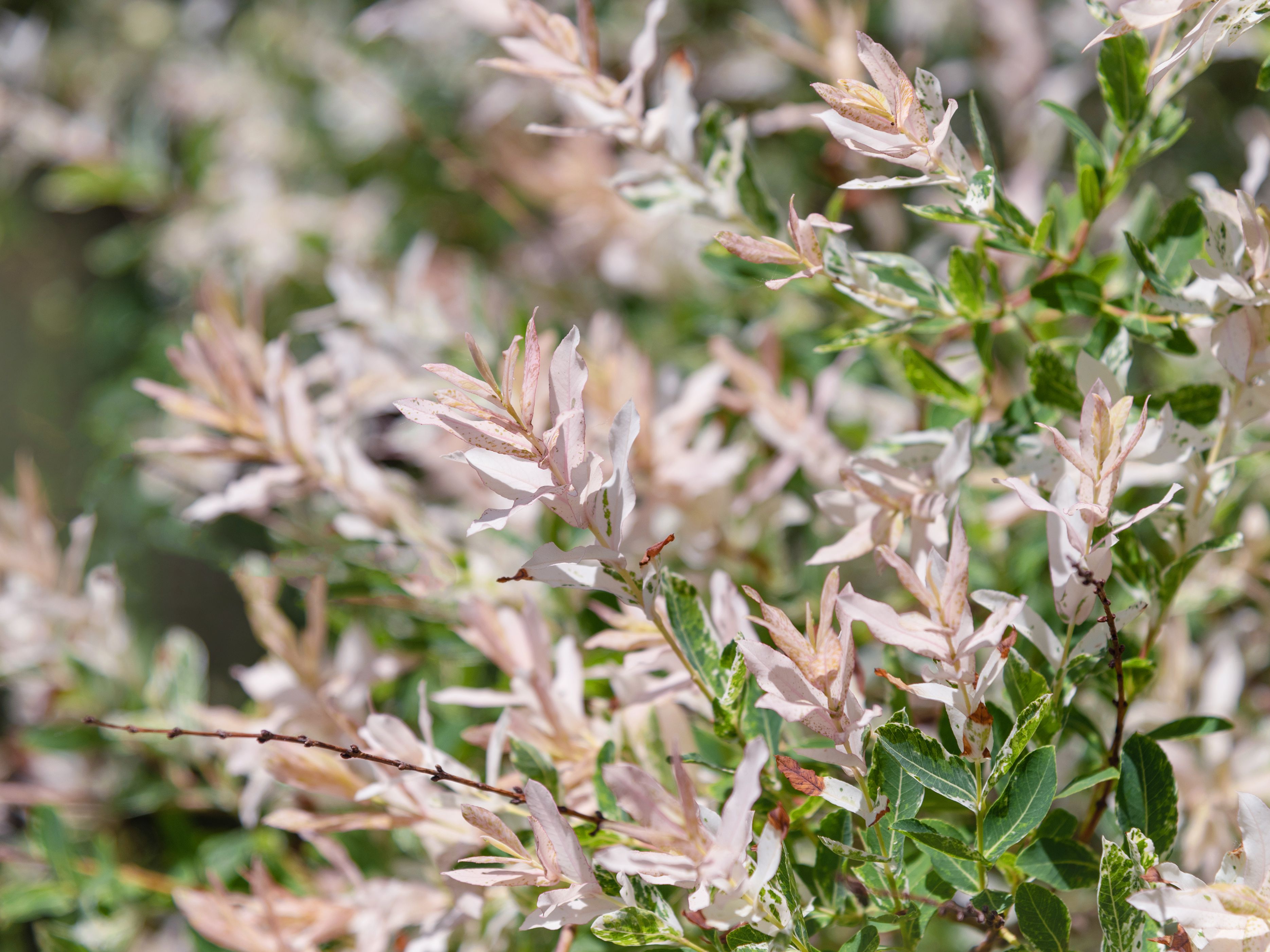 Krátky popis rastliny: Vŕba japonská 'Flamingo' je kompaktný ker s farebnými listami a jemnými vetvami, charakteristickými pre vŕby.